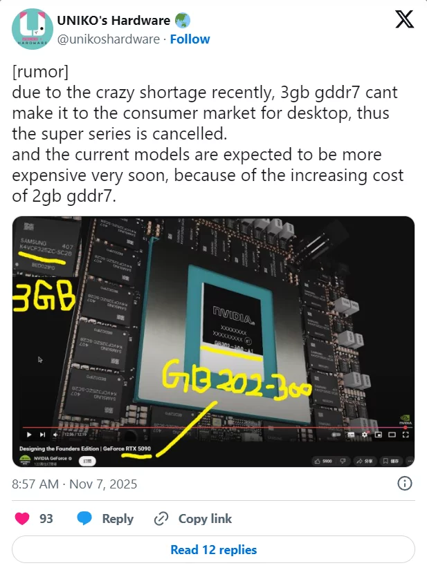 Проблема загострюється загальним зростанням цін на ринку пам'яті, де попит з боку виробників обладнання для штучного інтелекту призвів до подорожчання модулів DDR5 і, очевидно, GDDR7, що може негативно позначитися і на вартості вже випущених настільних відеокарт RTX 50-ї серії, які використовують 2ГБ чіпи. Важно розуміти, що NVIDIA офіційно не анонсувала лінійку SUPER і все, що відомо про ці карти, — заяви інсайдерів, при цьому партнери NVIDIA також не отримували конкретних специфікацій, що опосередковано вказує на невизначеність у планах.