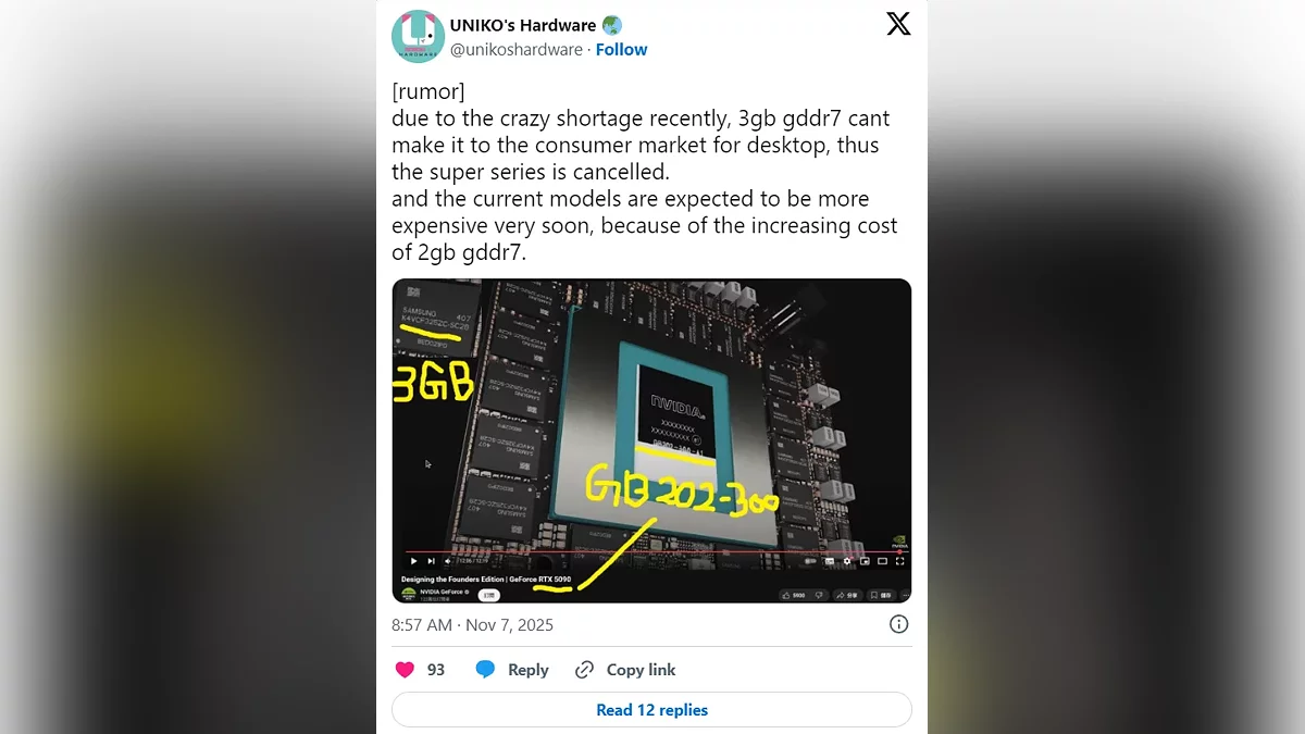Спочатку вважалося, що саме ці чіпи пам'яті стануть ключовим покращенням для майбутніх моделей RTX 5080 SUPER, RTX 5070 Ti SUPER та RTX 5070 SUPER. Вони дозволили б значно збільшити відеопам'ять без зміни шини: до 24 ГБ для старших моделей і до 18 ГБ для молодшої, однак, як з'ясувалося, доступні запаси 3ГБ GDDR7 тепер направлять на інші продукти — наприклад, на мобільну RTX 5090 для ноутбуків і професійні моделі RTX PRO 6000 Blackwell, де прибуток вищий.
