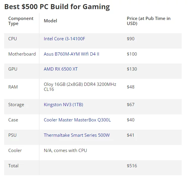 Для старту в PC-геймінгу не потрібні великі вкладення і навіть за $500 (близько 41 000 гривень) можна скласти систему з дискретною відеокартою, яка потягне багато сучасних ігор у роздільній здатності 1080p на середніх налаштуваннях. Основу такої збірки складає процесор Intel Core i3-14100F, у парі з материнською платою ASUS B760M-AYW WIFI D4 та 16 ГБ недорогої оперативної пам'яті DDR4. За графіку відповідає відеокарта AMD Radeon RX 6500 XT, чого цілком достатньо для комфортної гри в більшість проектів, хоч і не на ультра-налаштуваннях.