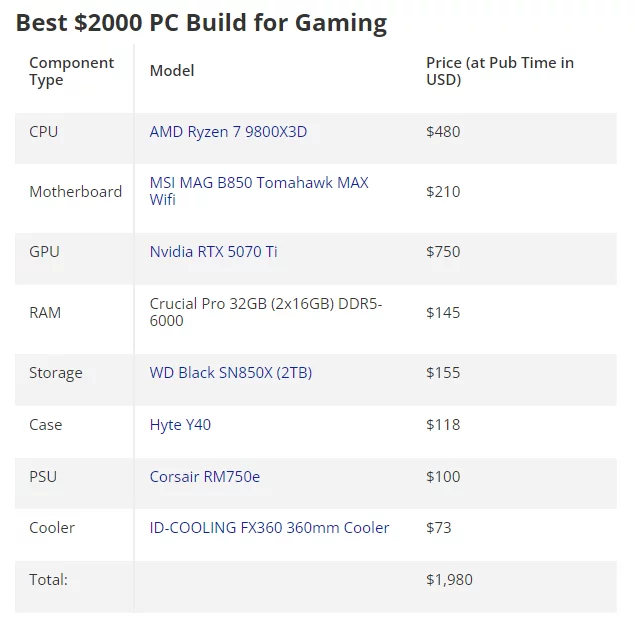 Збірки від $1 500 призначені для тих, хто не готовий до компромісів. Зв'язка процесора AMD Ryzen 7 7800X3D або Ryzen 7 9800X3D з відеокартою RTX 5070 Ti з 16 ГБ пам'яті дозволяє насолоджуватися грою в 4К з максимальним рівнем деталізації та увімкненою трасуванням променів. При цьому система має 32 ГБ ОЗУ та SSD на 2 ТБ. Така збірка обійдеться в $1 980 (близько 161 000 гривень).