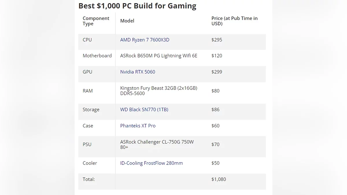 Бюджет у тисячу доларів відкриває двері в світ якісного геймінгу у роздільній здатності 1440p. Тут експерти Tom's Hardware радять переходити на платформу AMD. Процесор Ryzen 7 7600X3D з його величезним кешем показує феноменальні результати в іграх. У парі з ним пропонується відеокарта NVIDIA RTX 5060, а також 32 ГБ пам'яті DDR5. При цьому системі не потрібна потужна СЖО і достатньо не найдорожчого повітряного кулера. Загальна вартість збірки оцінюється в $1 080 (близько 88 000 гривень).
