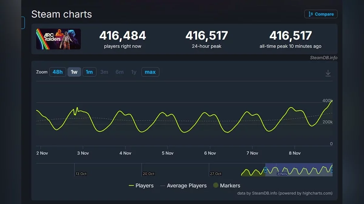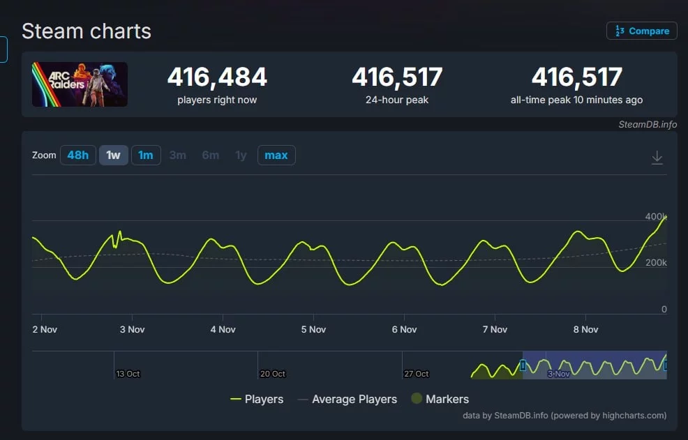 За даними Steam, на піку в ARC Raiders грав більше 462 тисяч користувачів, що дозволило проєкту обійти Helldivers 2 за стартовим онлайн-рекордом (458 709 гравців). Зараз у шутера близько 89% позитивних відгуків на основі більше ніж 77 тисяч оцінок.