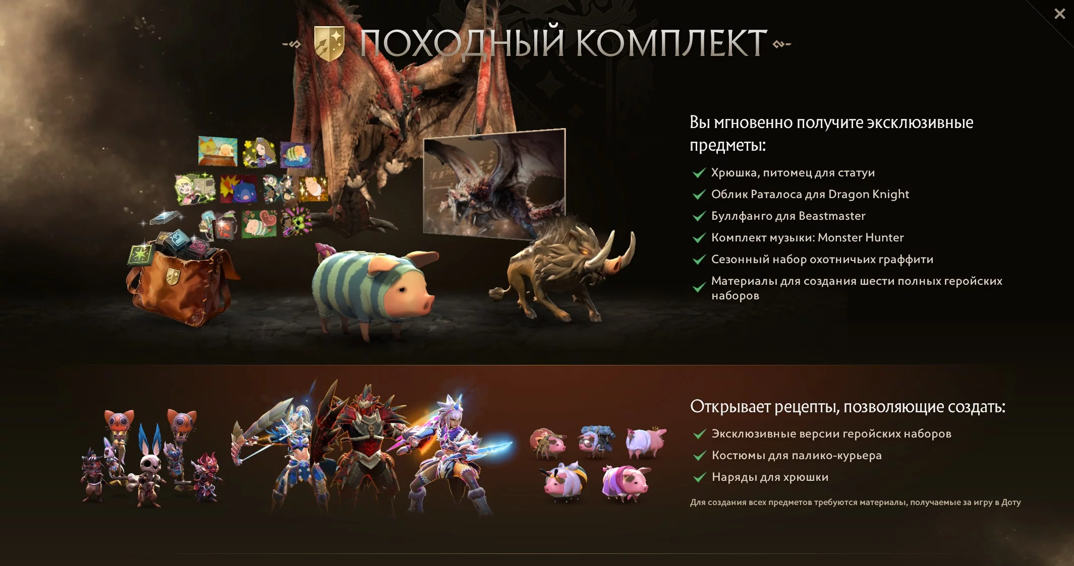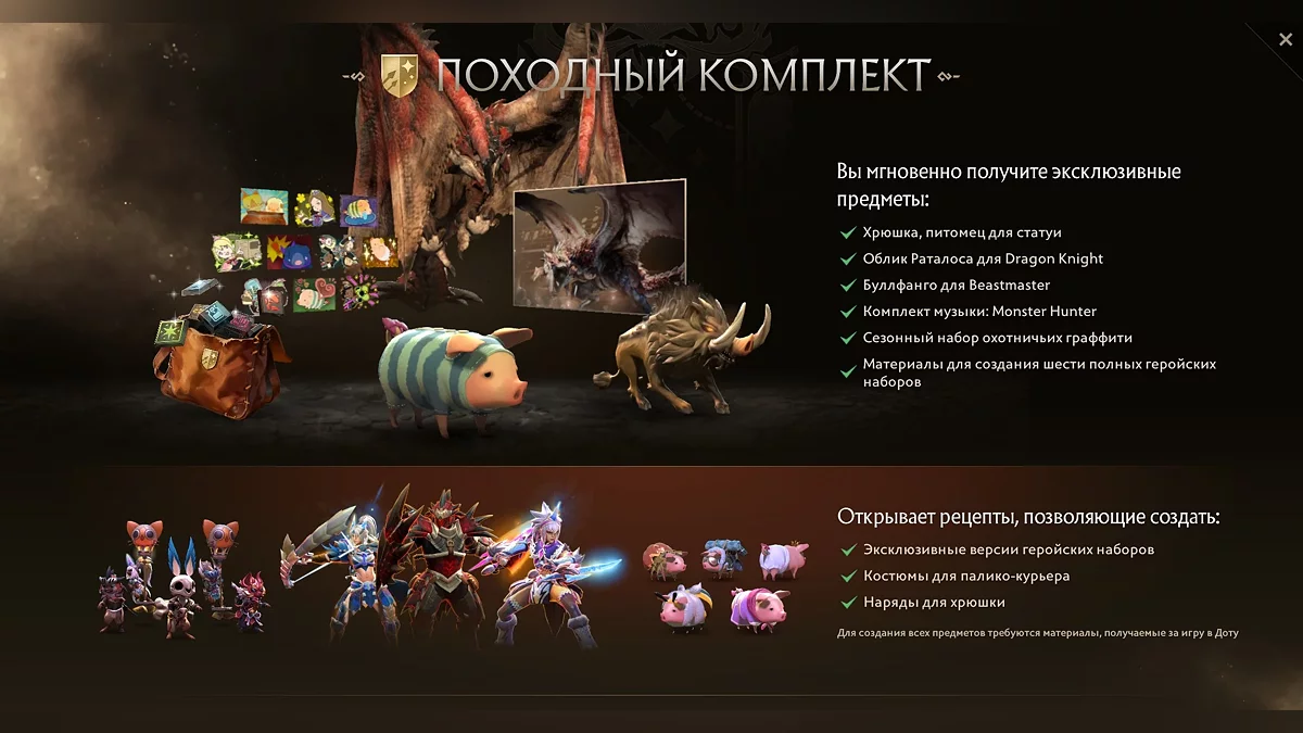 Valve анонсувала перший офіційний кросовер по Dota 2. У популярну MOBA додали контент з серії Monster Hunter: шість комплектів броні, кур'єр-паліко та особистий домашній улюбленець-свинка.