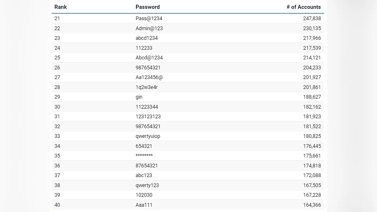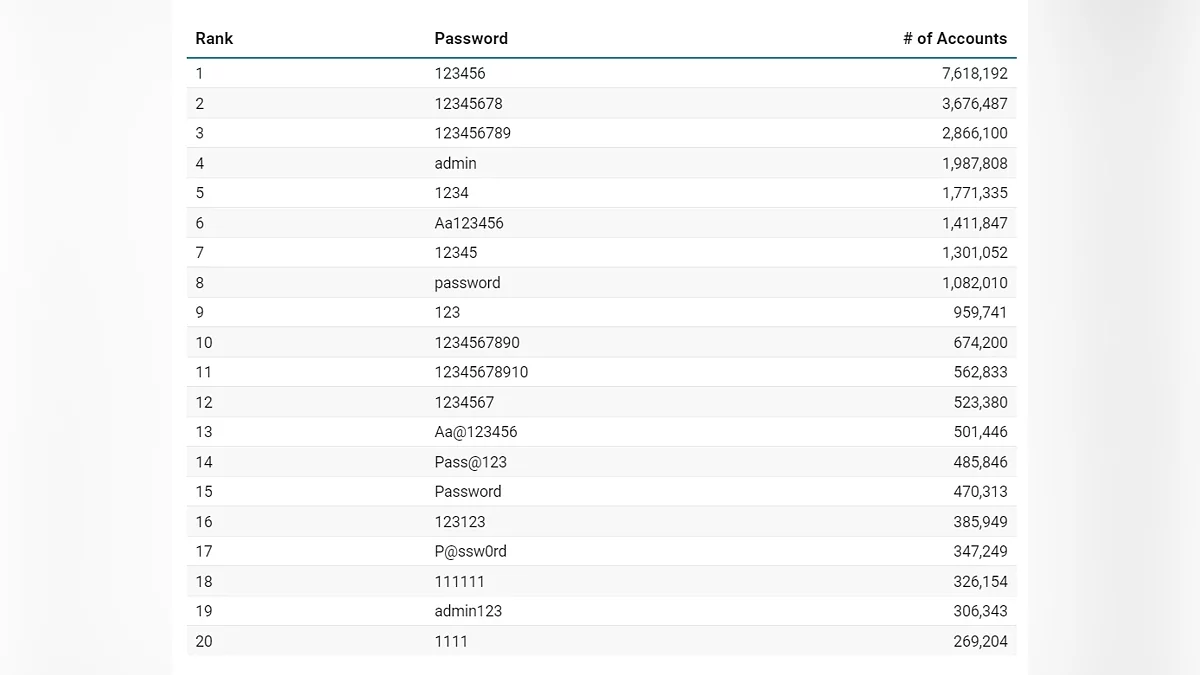 Фахівці, які вивчали інформацію з хакерських форумів, констатують: найпоширеніші комбінації для захисту облікових записів залишаються примітивними, а лідером антирейтингу знову стала послідовність «123456», яку використовували мільйони разів. У десятку найгірших також стабільно входять «password», «admin» та інші прості набори цифр і букв.