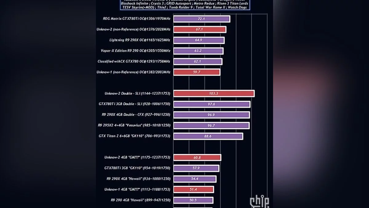 Так, не шибко интересующимся «железом», но желающим быть в курсе событий пользователям будет интересно узнать, что приготовила нам Nvidia. Китайский портал ChipHell опубликовал таблицу с данными о производительности GeForce GTX 980 и 970, замаскированных под кодовые названия Unknown-2 и Unknown-1 соответственно: