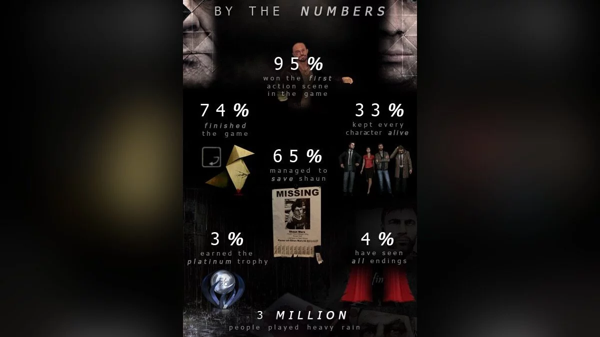 Из этой картинки видно, что с честью вышли из первой экшен-сцены 95 процентов геймеров. Прошли игру до конца, правда, всего 74 процента. Только у 33 процентов игроков в живых остались все персонажи. При этом 65 процентов спасли Шона. Всего 4 процента геймеров увидели все концовки в игре и только 3 процента заработали платиновый трофей. Ну и в заключение можно сказать, что в общей сложности в Heavy Rain сыграло 3 миллиона человек.