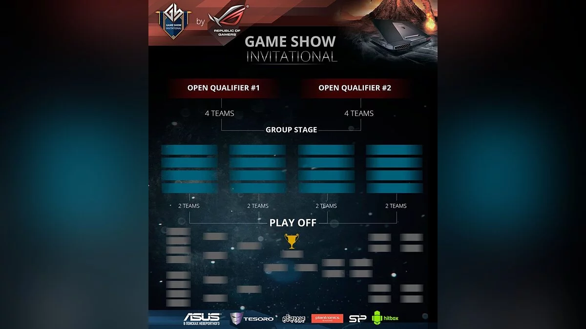 - Два открытых отборочных турнира, которые пройдут по олимпийской системе. Команды, которые проходят в полуфинал, автоматически попадают в основную часть Game Show Invitational.