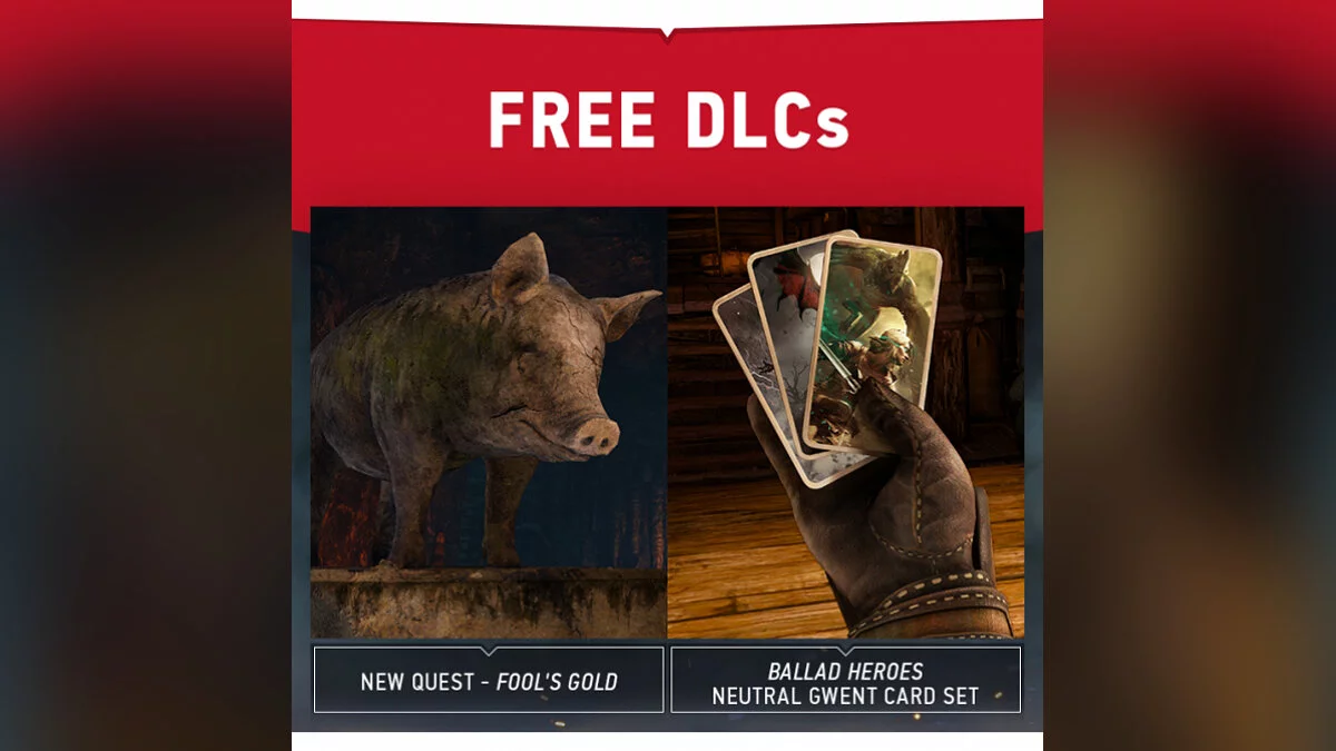 То есть речь идет о дополнительном квесте «Золото дураков» (Геральт и местный деревенский дурачок попытаются выяснить, почему жители деревни превратились в свиней) и карты «Геройские баллады» для карточной игры Гвент.