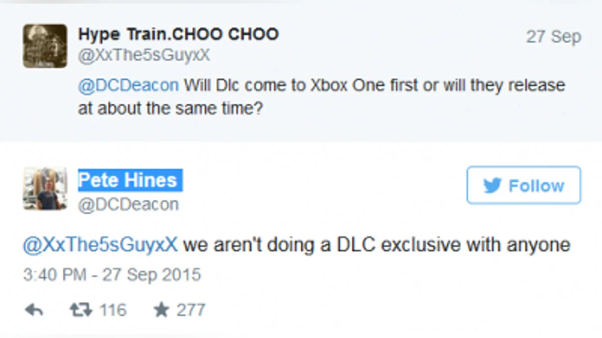 На этот раз отличился вице-президент Bethesda Пит Хайнс (Pete Hines) — на прямой вопрос о временной эксклюзивности дополнений для какой-либо платформы он ответил, что никому ждать не придется, и все DLC будут выходить одновременно для всех версий Fallout 4.