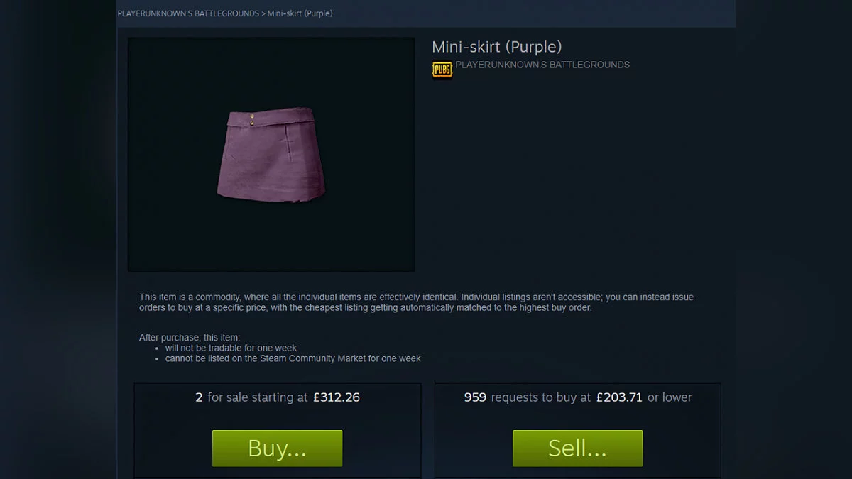 Точная цена пурпурной мини-юбки составляет 312.26 фунтов. Данная мини-юбка является предметом, который можно получить из ящика Battle Royale, который выпадает каждый месяц. Но это не первый внутриигровой предмет в Playerunknown's Battlegrounds, который был продан за большие деньги.