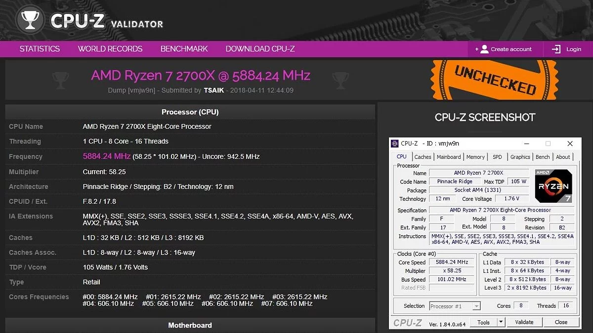 Интернет-ресурс Videocardz решил проверить разгонный потенциал новой линейки процессоров AMD на примере Ryzen 7 2700X. Частота по шине BCLK была установлена на отметке 101,02 МГц, а множитель — x58,25. В итоге получился восьмиядерный чип с тактовой частотой 5,88 ГГц, что всего на несколько МГц меньше, чем лучший результат у всей линейки Ryzen первого поколения.