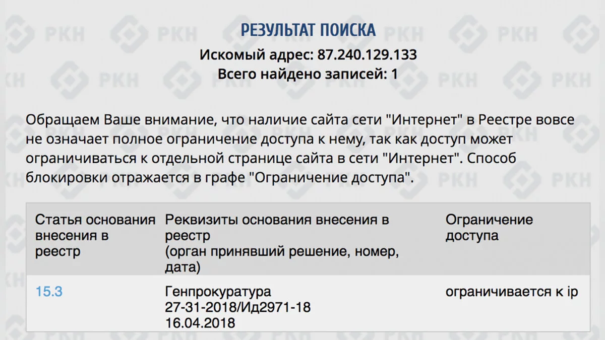 Всего Роскомнадзор заблокировал один IP-адрес ВКонтакте (87.240.129.133), один — Одноклассников и пять — Яндекса. Почему российские ресурсы пострадали от действий Роскомнадзора, пока неизвестно, но уже в 2:00 ночи (МСК) IP-адреса были убраны из списка запрещенных.