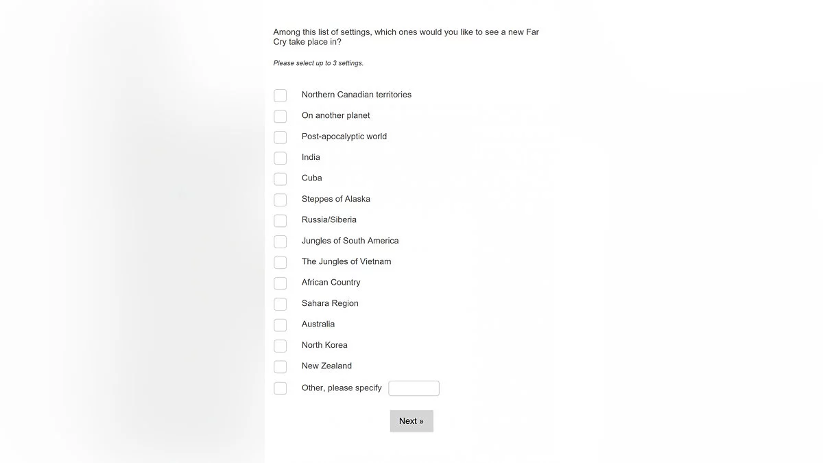 Компания Ubisoft начала массовую рассылку электронных писем для всех поклонников серии Far Cry с небольшим опросом, один из вопросов которого привлек внимание фанатов: «Какой сеттинг вы бы хотели видеть в Far Cry 6?».