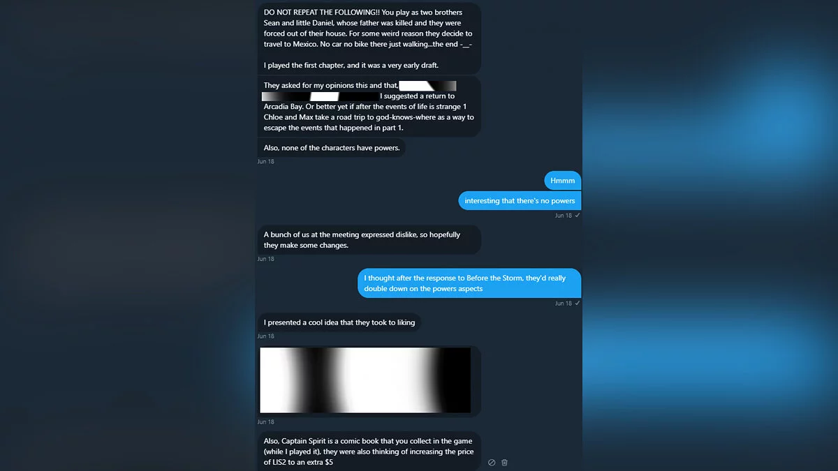 Они спросили моё мнение об этом [часть слов замазана]. Я предложил вернуться в Аркадия-Бэй (Arcadia Bay) [место действия Life is Strange], или, лучше, если бы после событий первой части Хлоя и Макс отправились бы в путешествие Бог-знает-куда, пытаясь убежать от событий первой части.