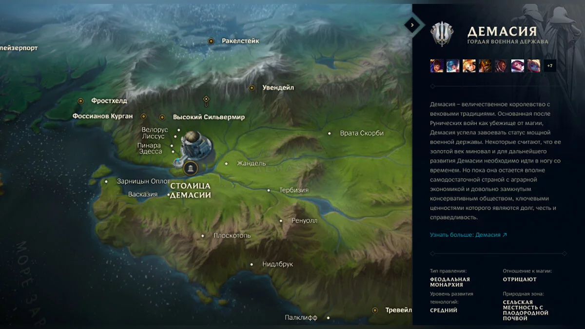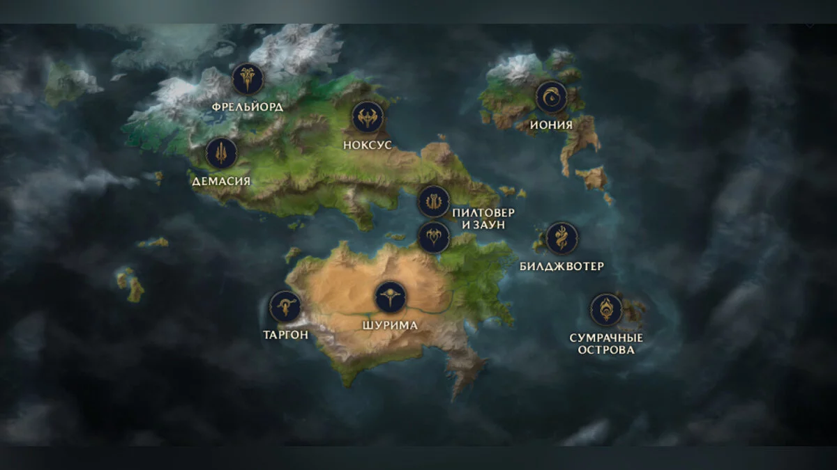 На карте можно выбрать не только различные крупные области Рунтерры, но и города. Почти для каждого из них приведена история и интересная информация: тип правления, отношение к магии, уровень развития технологий и природная зона. Также для каждой местности будет показан список чемпионов, которые к ней относятся.