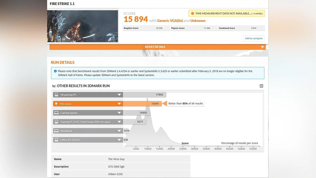 В 3DMark GTX 2060 набрала 15 894 балла, в то время как средний показатель GTX 1080 составляет 19 711 баллов, а GTX 980 в SLI-режиме — 17 805 баллов.