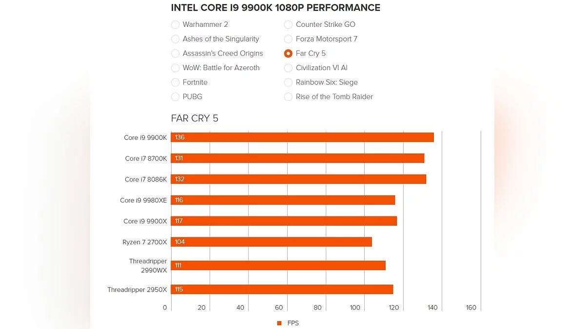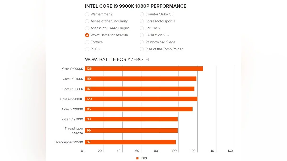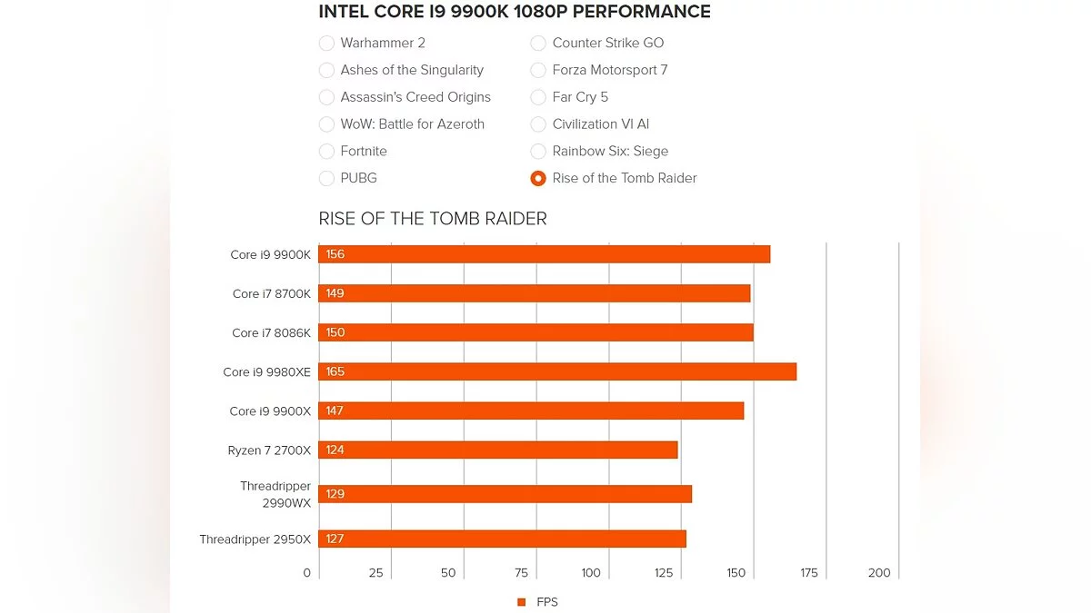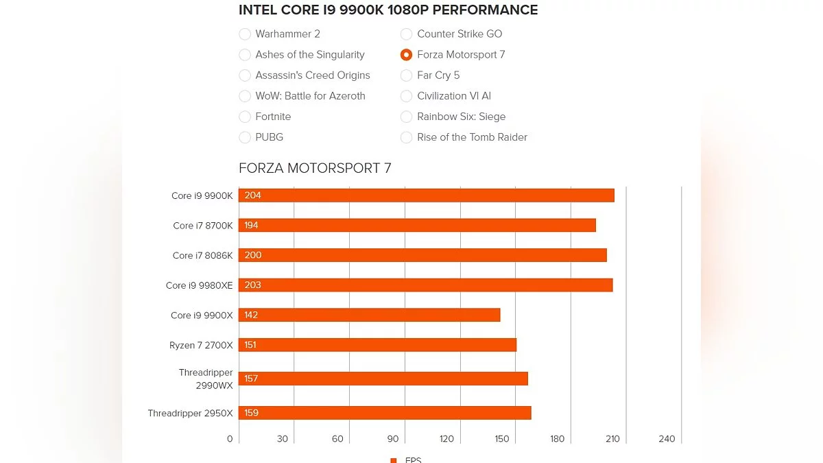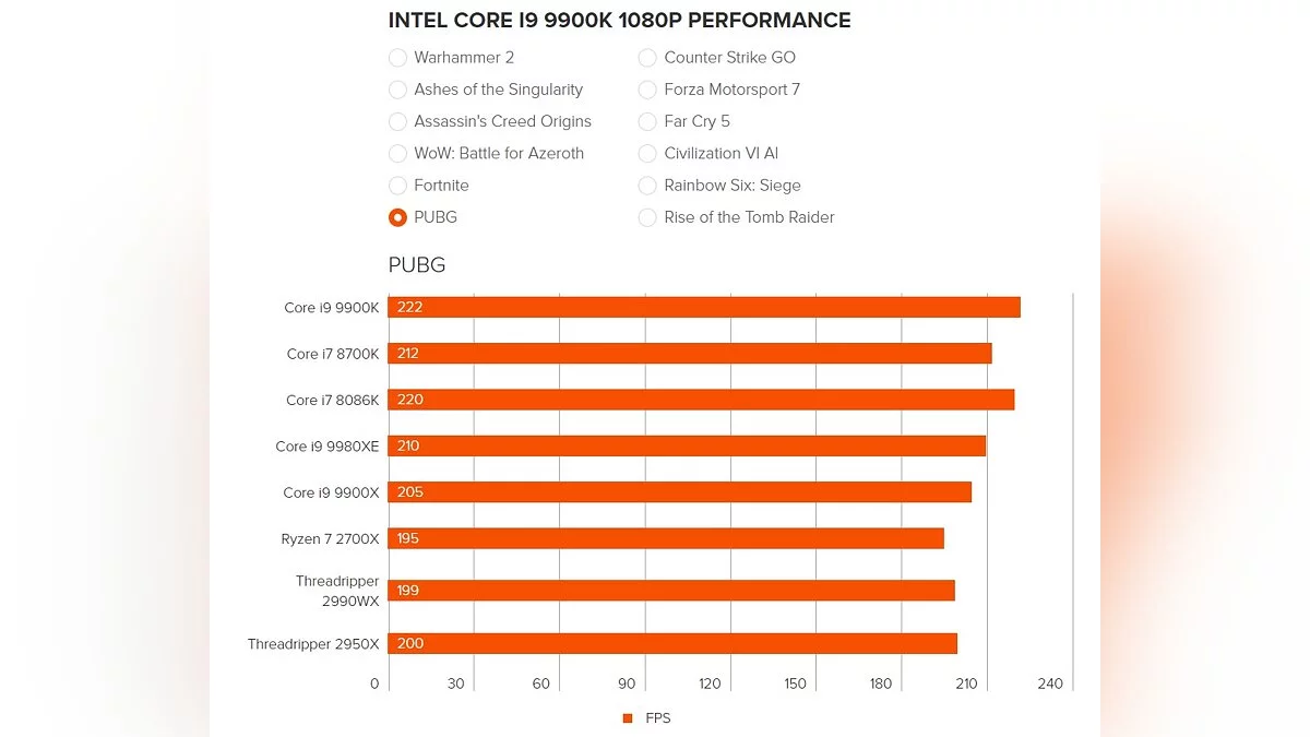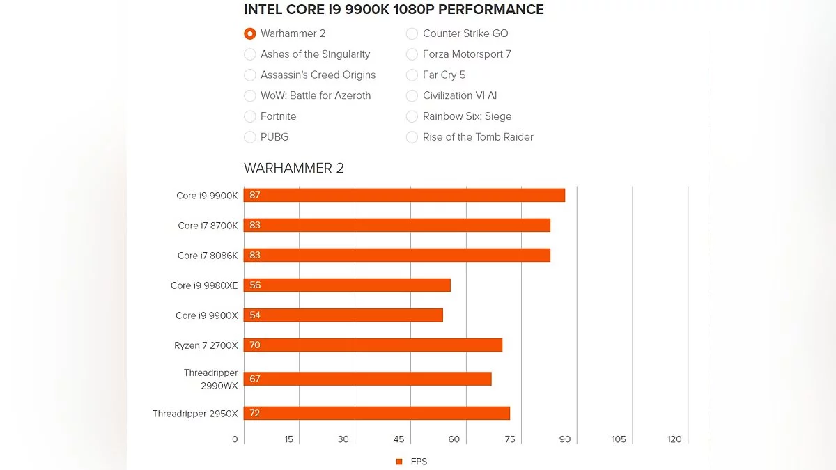 Чтобы перепроверить информацию, для тестов были взяты популярные игры на PC — Total War: Warhammer 2, Ashes of the Singularity, Assassin's Creed Origins, WoW: Battle for Azeroth, Fortnite, PUBG, Counter-Strike: Global Offensive, Forza Motorsport 7, Far Cry 5, Civilization 6, Rainbow Six: Siege и Rise of the Tomb Raider.