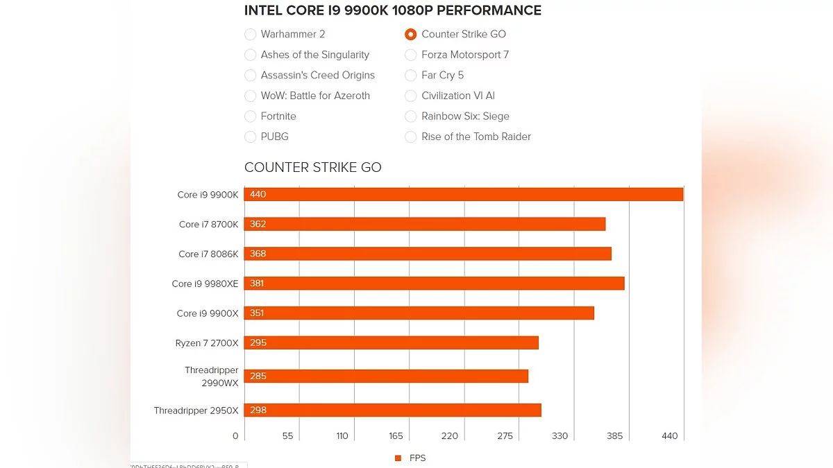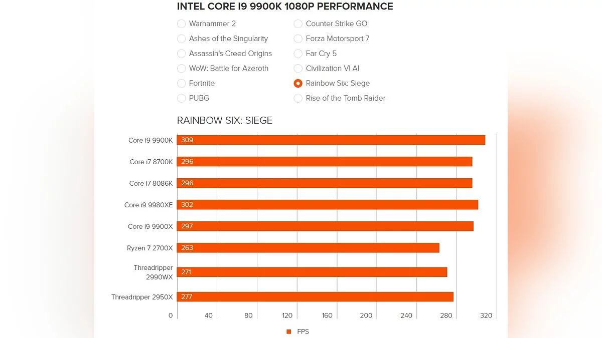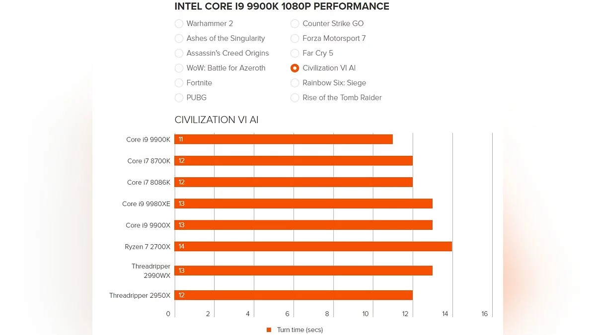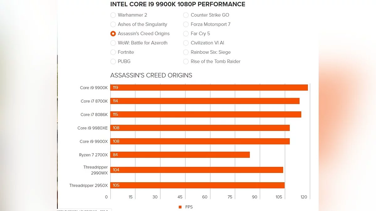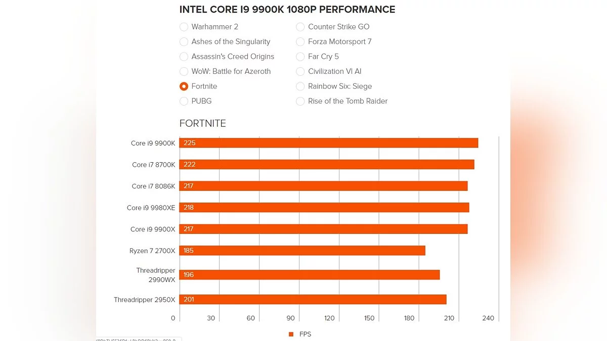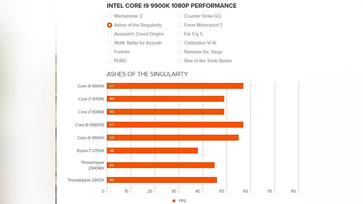 Чтобы перепроверить информацию, для тестов были взяты популярные игры на PC — Total War: Warhammer 2, Ashes of the Singularity, Assassin's Creed Origins, WoW: Battle for Azeroth, Fortnite, PUBG, Counter-Strike: Global Offensive, Forza Motorsport 7, Far Cry 5, Civilization 6, Rainbow Six: Siege и Rise of the Tomb Raider.