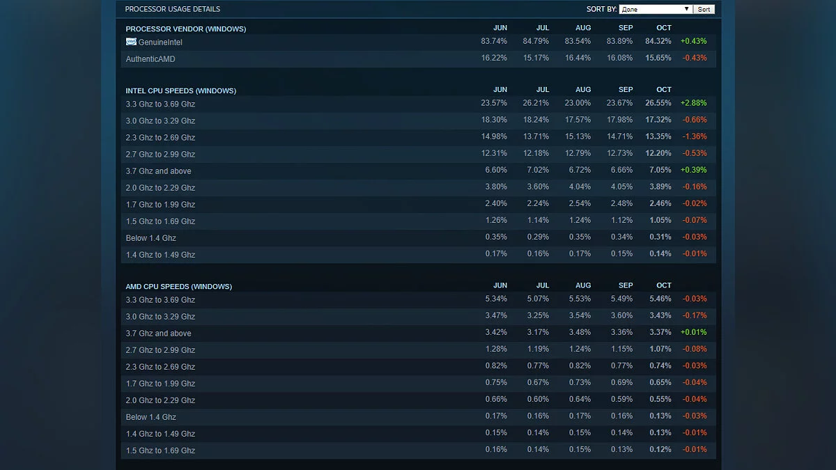 Что касается железа, особых изменений не произошло. Среди процессоров геймеры в основном играют на Intel (84,32 %), а среди видеокарт по-прежнему побеждает Nvidia.