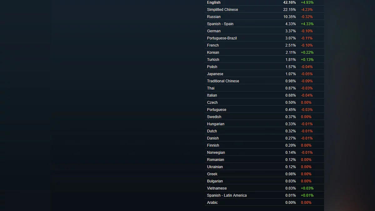Доля английского выросла почти на 5 % и составляет 42,16 %. Русский язык выбирает каждый десятый пользователь Steam. Так его доля составила 10,35 % (на 0,32 % меньше, чем в прошлом месяце). Вторым по популярности языком является китайский (22,15 %), хотя его доля снизилась на 4,23 % по сравнению с прошлым периодом.