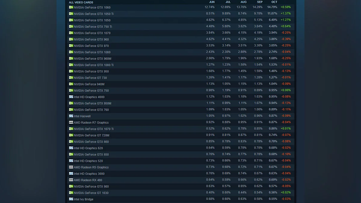 Стоит заметить, что несмотря на устаревание линейки видеокарт GTX, их доля в Steam продолжает расти. Так, к примеру, 14,79 % игроков используют GTX 1060, а еще 11,07 % — GTX 1050Ti.