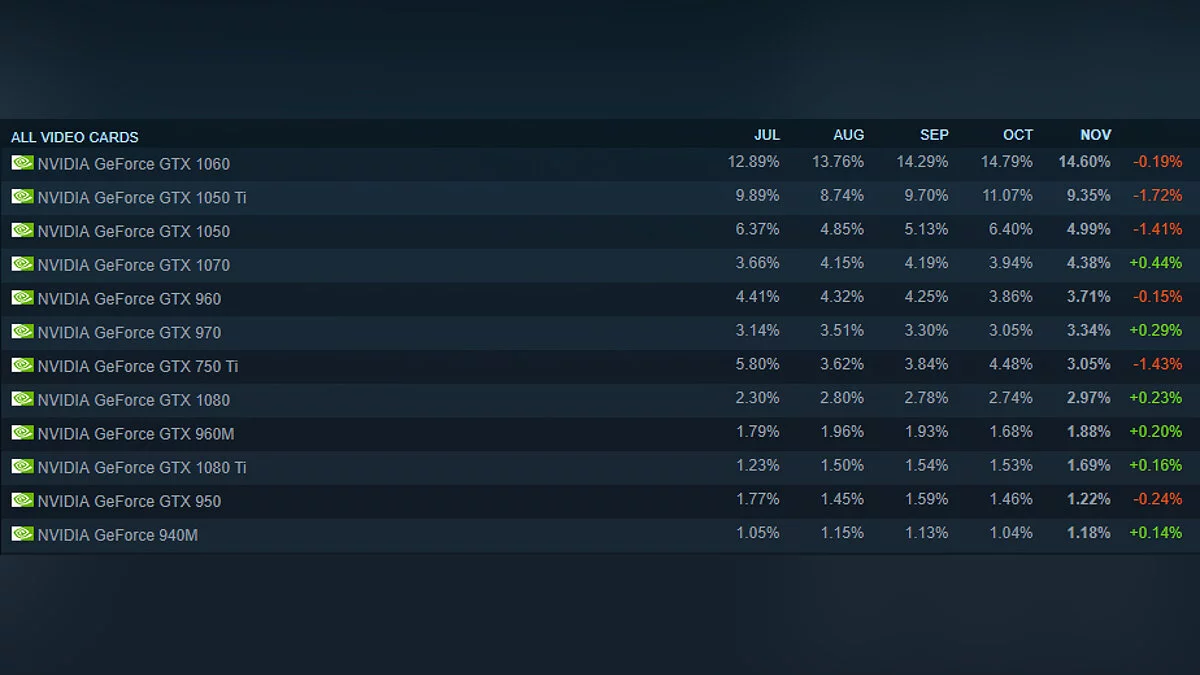 Также довольно интересным фактом является то, что начала снижаться популярность видеокарт Nvidia GTX 1060 (на 0,19 %), GTX 1050Ti (на 1,72 %) и GTX 1050 (на 1,41 %). До ноября наблюдался постоянный рост пользователей с этими моделями видеокарт, но теперь их популярность снизилась, хотя они по-прежнему входят в ТОП 3.