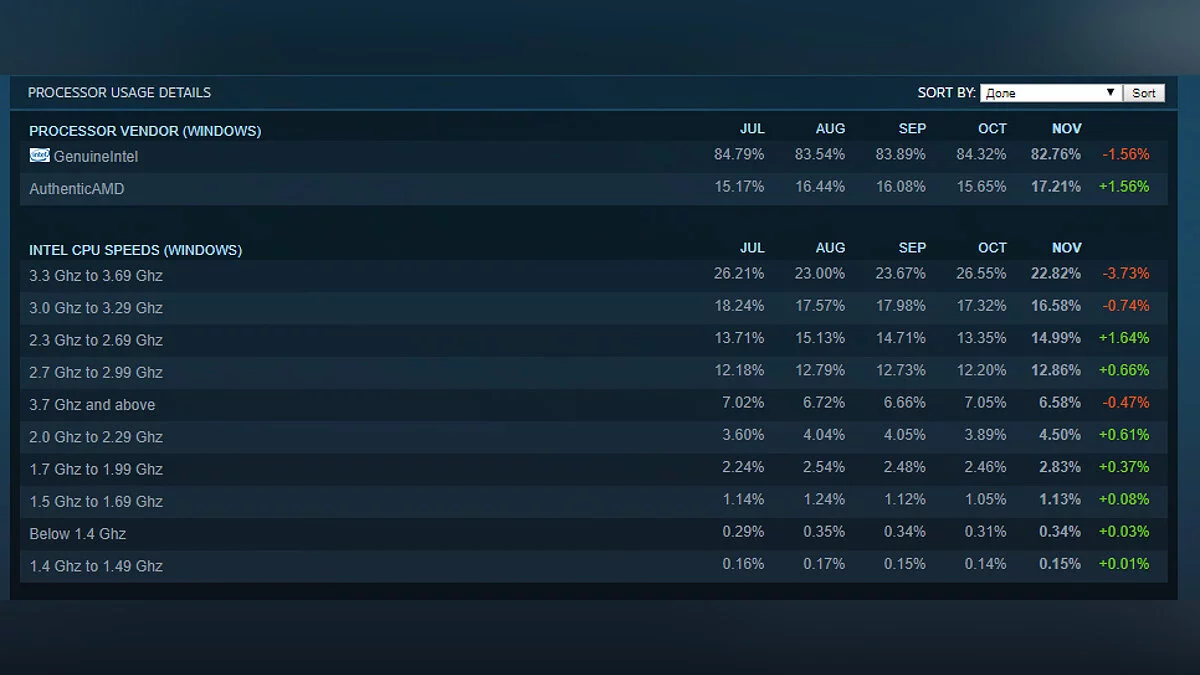 Среди пользователей Steam прошел очередной опрос, в ходе которого Valve выяснила, как изменилась статистика по используемому железу и ОС за ноябрь.