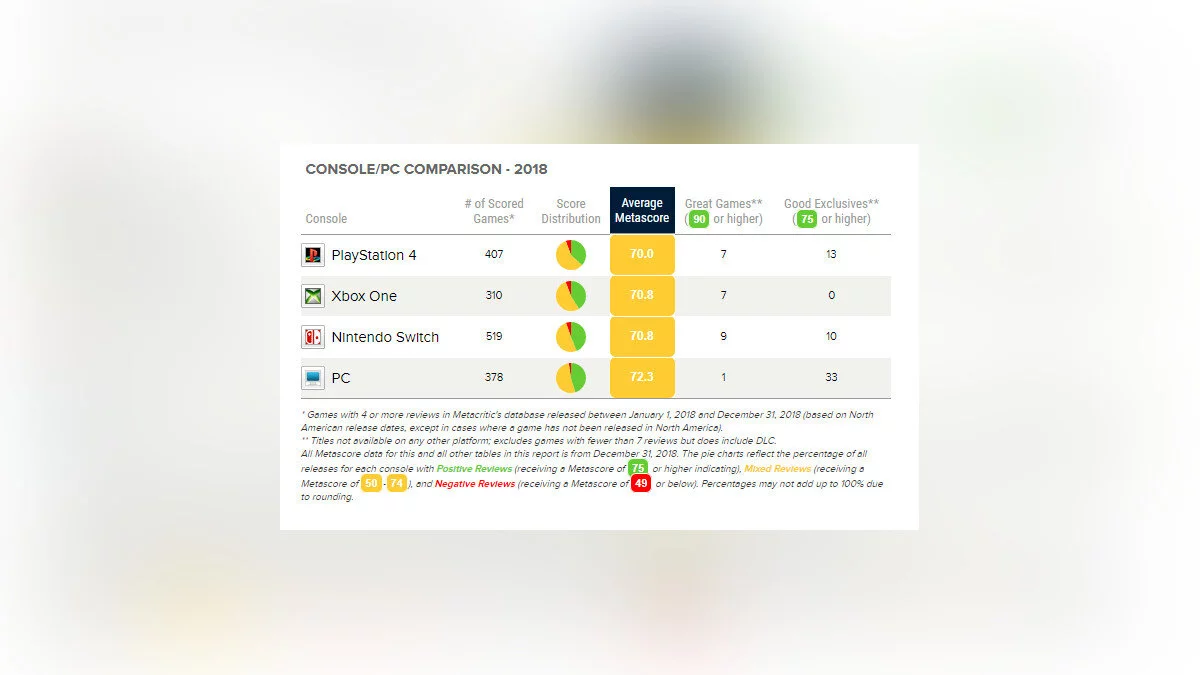 Общее количество оцененных в 2018 году игр. Положительная оценка — от 75 баллов, смешанная оценка — от 50 и до 74, а негативная оценка — до 49 баллов. Средняя оценка всех игр для каждой платформы — не ниже 70 баллов: