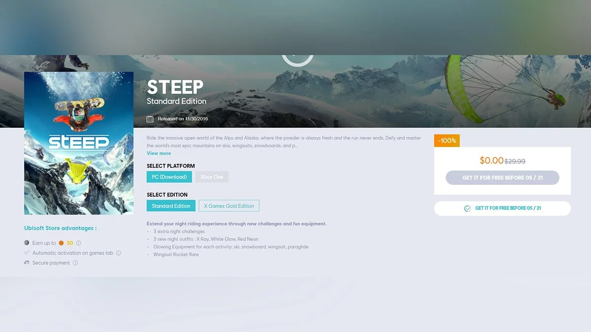 В американском Ubisoft Store симулятор экстремальных видов спорта Steep доступен со скидкой 100%. То есть фактически игра стала бесплатной, но геймеры на форуме Reddit сообщают, что пока не могут ее скачать.