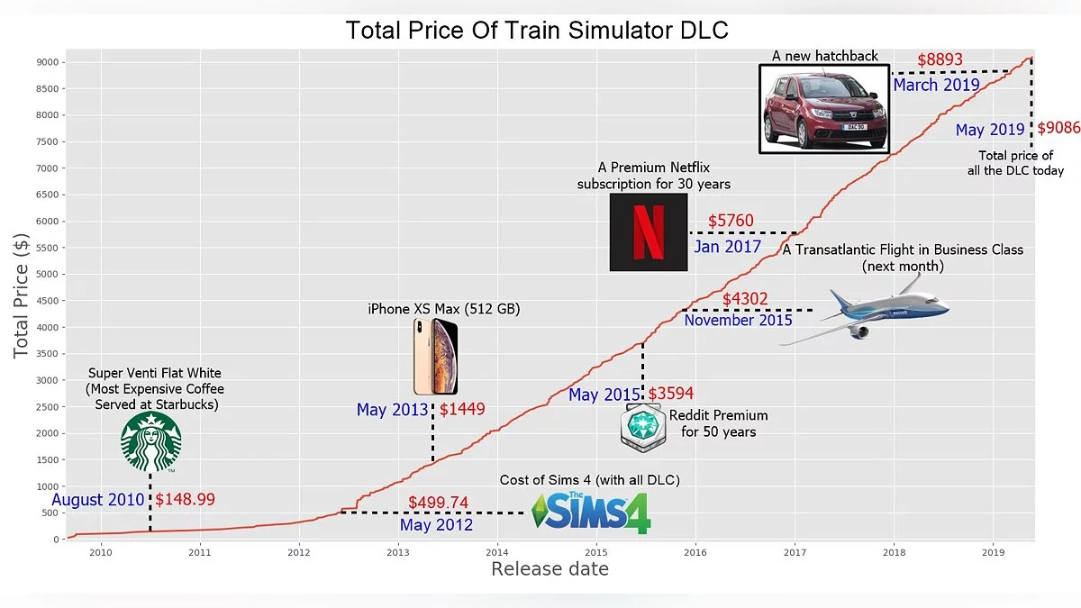 На Reddit появилось интересное обсуждение, начатое пользователем под ником Shahar603. Он опубликовал график стоимости всех DLC для Train Simulator: по его подсчетам, саму игру и все дополнения для неё можно купить за 9 086 долларов.