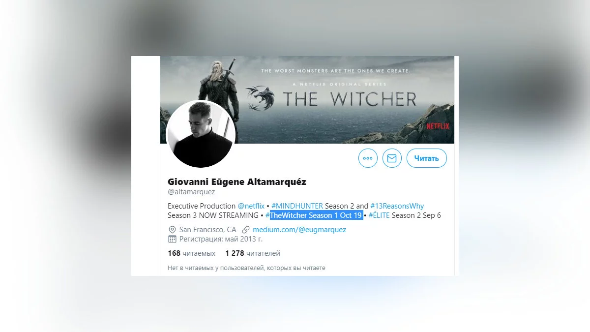 На страничке исполнительного продюсера Netflix Джованни Юджина Альтамаркеза (Giovanni Eūgene Altamarquéz) в Twitter написано, что премьера первого сезона «Ведьмака» состоится 19 октября. Ранее в сети появлялся слух, что премьера намечена на 20 декабря.