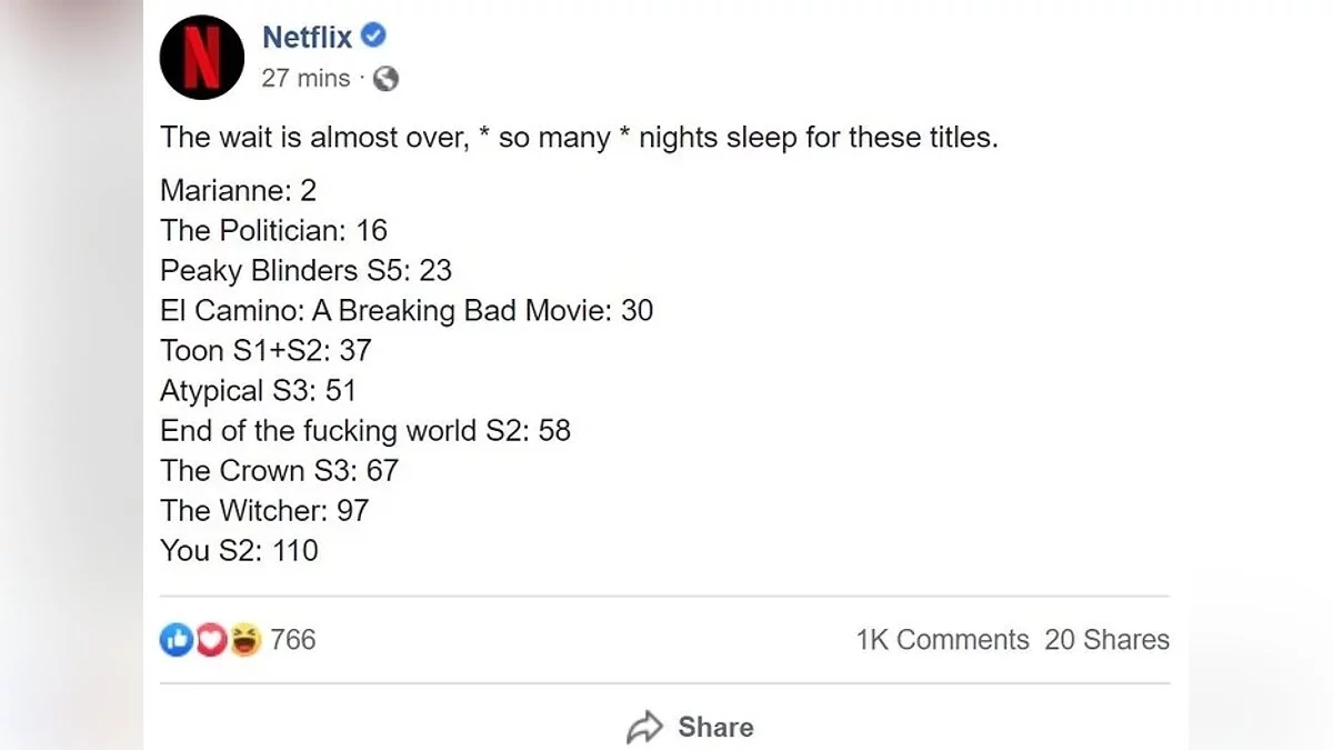 Сейчас пост удален, но мы-то знаем, что интернет помнит все. Netflix сказал: «Ожидание почти окончено, вот сколько ночей осталось до премьеры этих сериалов». Согласно посту, до выхода сериала Marianne осталось 2 дня (официальная премьера намечена на 13 сентября), а ждать «Ведьмака» осталось еще 97 ночей — то есть до 17 декабря 2019 года.