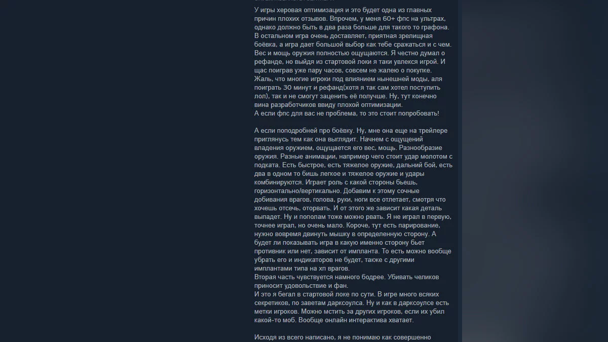 На момент написания у игры смешанные оценки — 60%. В основном геймеры жалуются на плохую оптимизацию. Среди плюсов выделяют боевую систему.