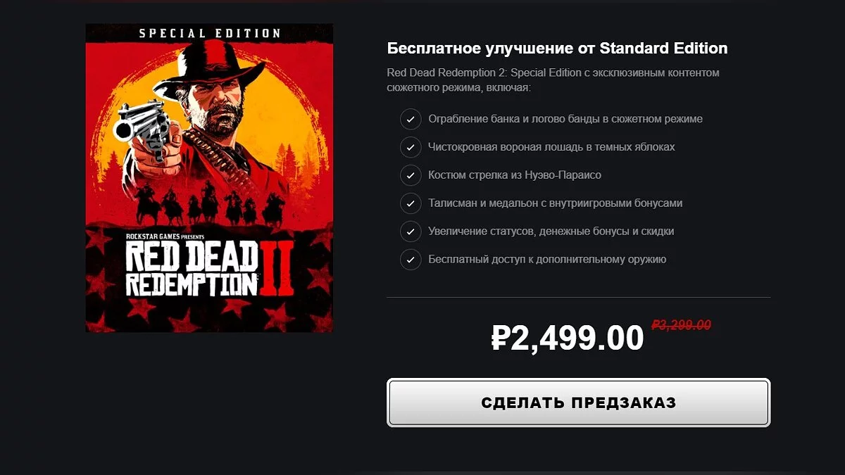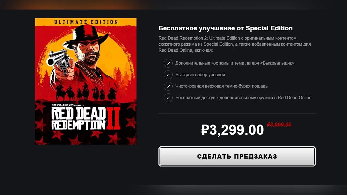 Для предзаказа в Rockstar Games Launcher уже доступны две версии: Special Edition (2499 рублей) и Ultimate Edition (3299 рублей). После релиза цены изменятся.
