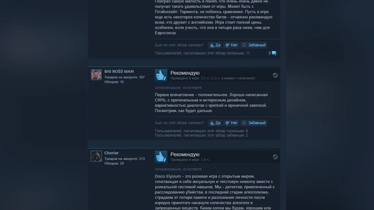 Из плюсов выделяют интересные вариативные диалоги, наличие уместного юмора и оригинальную систему абилок. Некоторые и вовсе пишут, что Disco Elysium шедевр в жанре классических RPG.