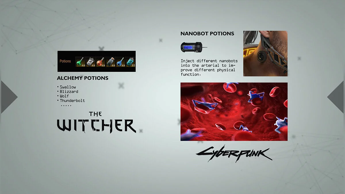 Различные зелья с наноботами дают ведьмаку эффекты Ласточки, Грома и других алхимических субстанций.