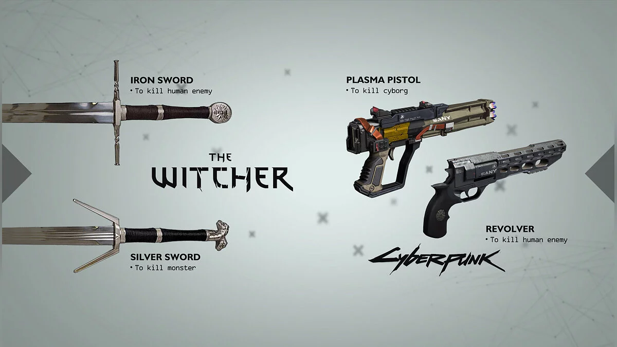 Плазменный пистолет и револьвер куда компактнее мечей. Один служит для убийства киборгов, другой — для людей. Кстати, на рукоятке револьвера можно заметить обсидиановую звезду Йеннифэр.