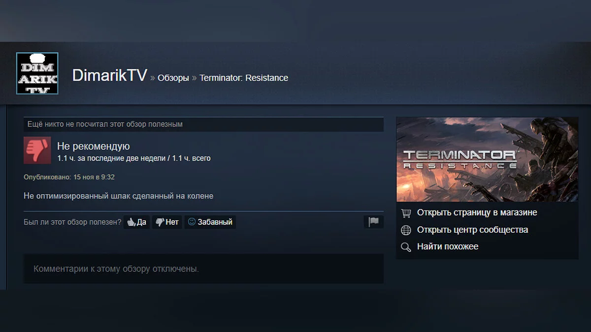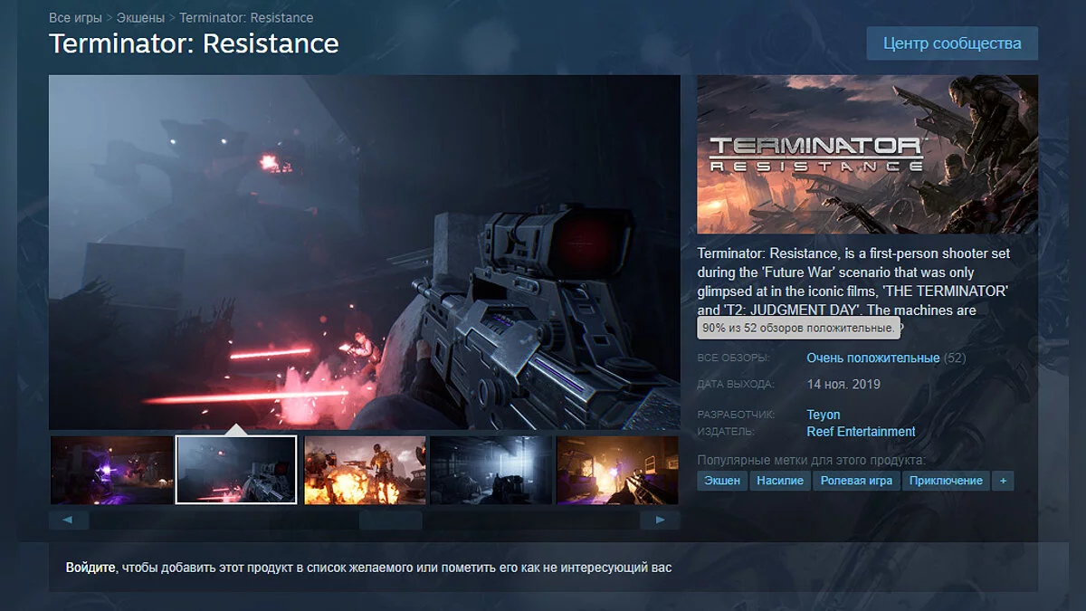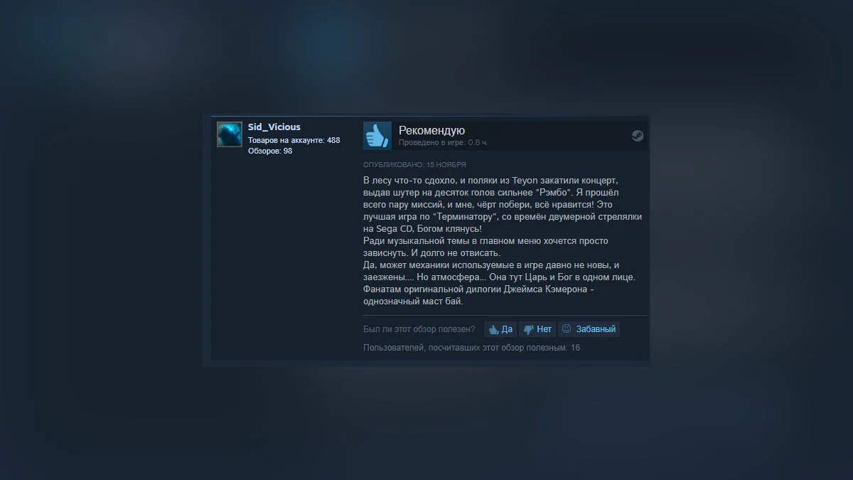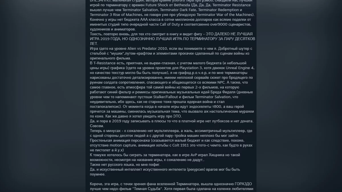 На момент написания новости у Terminator: Resistance 90% положительных отзывов от игроков. Большинство геймеров хвалят игру за атмосферу. К минусам некоторые игроки причисляют плохую оптимизацию.