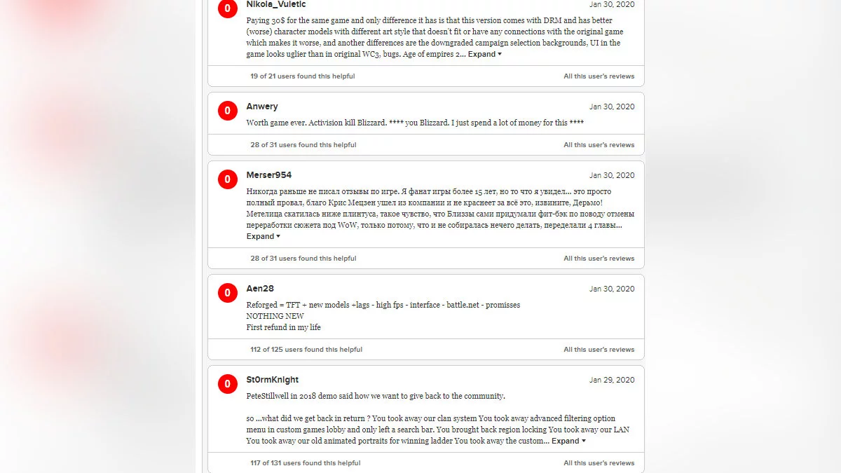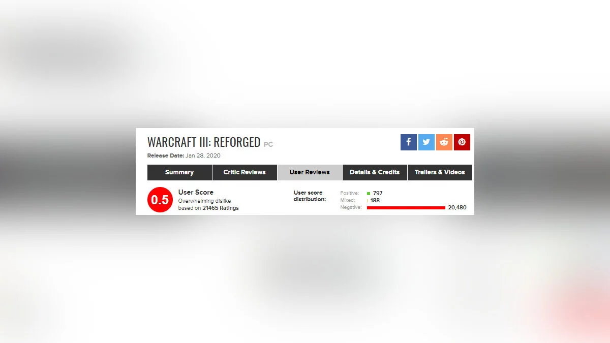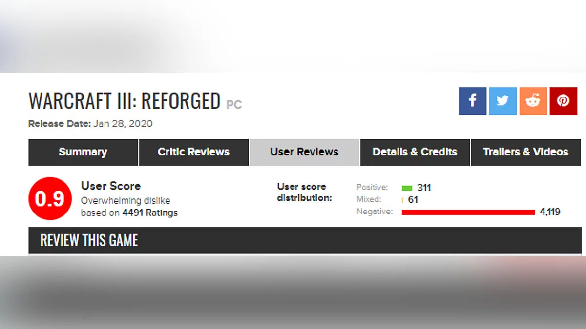 На момент написания новости средняя пользовательская оценка Warcraft 3: Reforged составляет 0,9 баллов. Это ниже, чем у многих других игр, которые были раскритикованы геймерами — Star Wars: Battlefront 2 (1,3 балла), Artifact (2,1 балла), Anthem (4,0 балла), Fallout 76 (2,7 баллов) и Ghost Recon Breakpoint (2,3 балла).