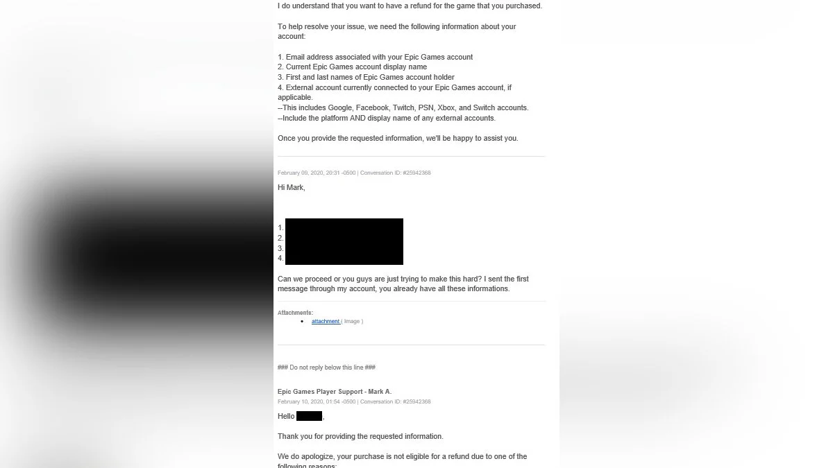Slyver08 c Reddit сообщил, что связался с поддержкой EGS, чтобы отменить предзаказ игры, которая, как он считает, выйдет «еще не скоро». В ответ пользователь получил объяснение, почему возврат средств не может быть произведен. Среди причин — запуск игры на промежуток более двух часов и превышение 14-дневного лимита.