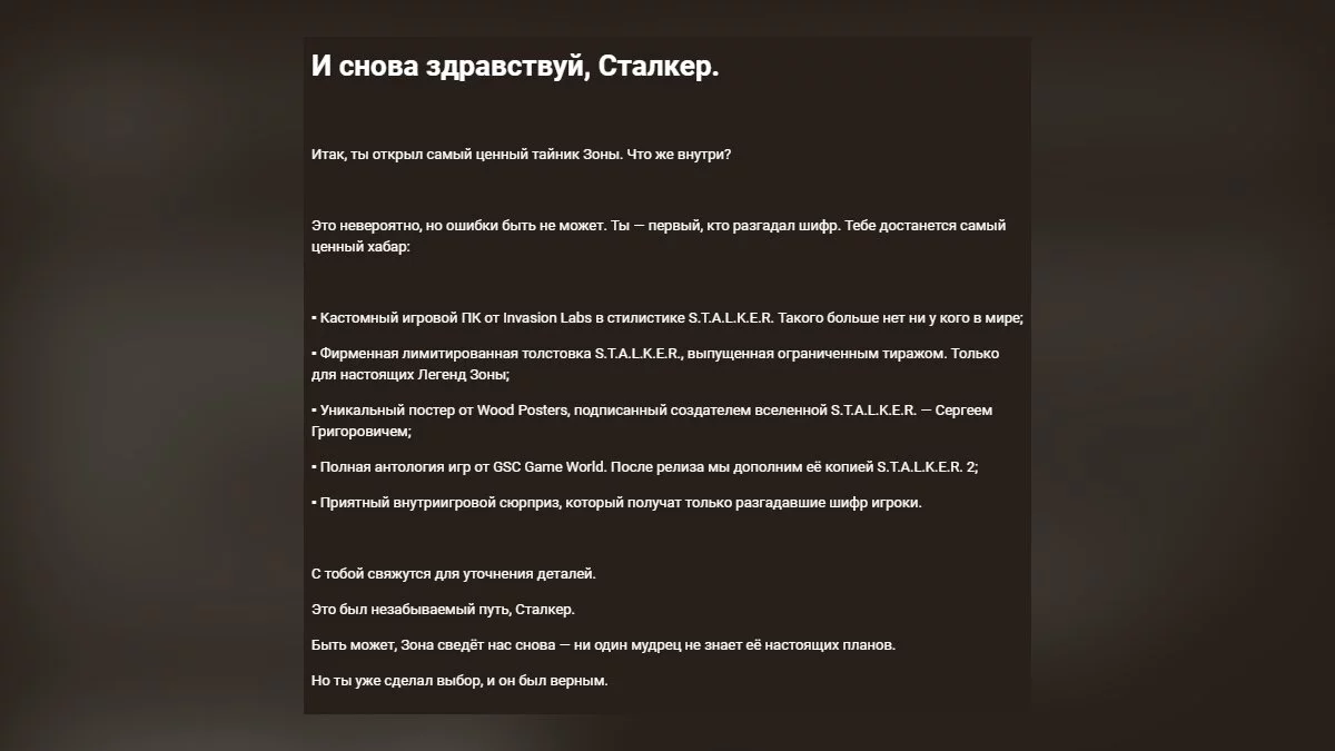 В конце квеста игроков ждал приятный сюрприз — первой сотне отгадавших GSC Game World вручила полную антологию игры вместе со S.T.A.L.K.E.R. 2, которую подарят на релизе. Более того, победителям также достанется уникальный внутриигровой предмет, который разработчики пока не раскрыли.