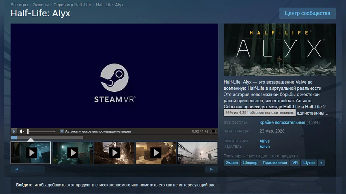 На момент написания новости рейтинг Half-Life: Alyx в Steam составляет 96%.