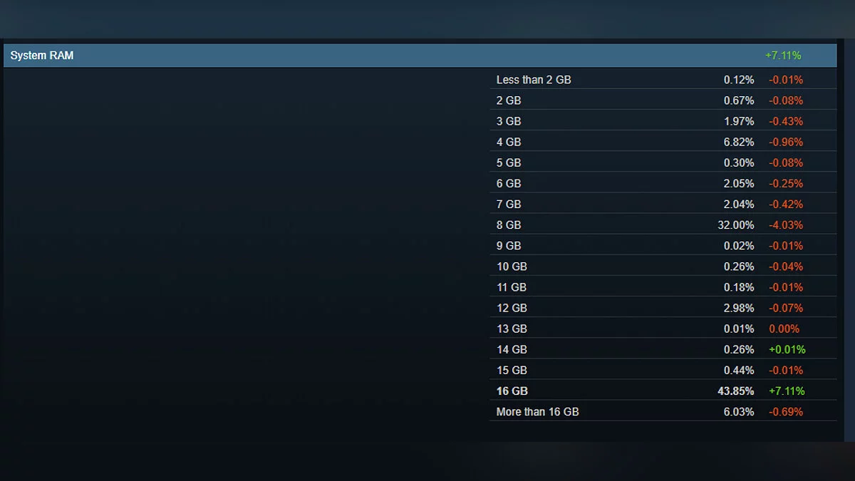 Примечательной является статистика касательно оперативной памяти. Количество пользователей с 16 ГБ ОЗУ выросло на 7,11% (43,85% в целом). А вот 8 ГБ используют всего 32,00% пользователей Steam.
