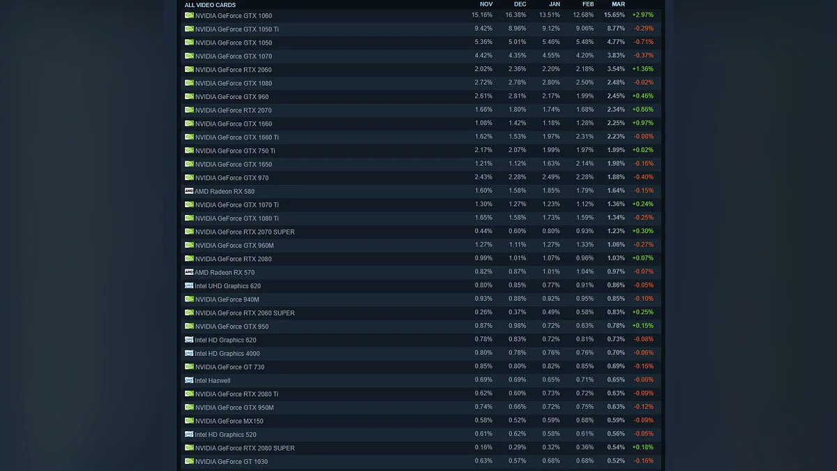 В первой тройке наиболее популярных видеокарт по-прежнему находятся GeForce GTX 1060 (15,65%), GeForce GTX 1050 Ti (8,77%) и GeForce GTX 1050 (4,77%). Стоит заметить, что по сравнению с февралем в марте количество пользователей с GTX 1060 выросло на 2,97%. Среди видеокарт от AMD наиболее популярной является Radeon RX 580 (1,64%).