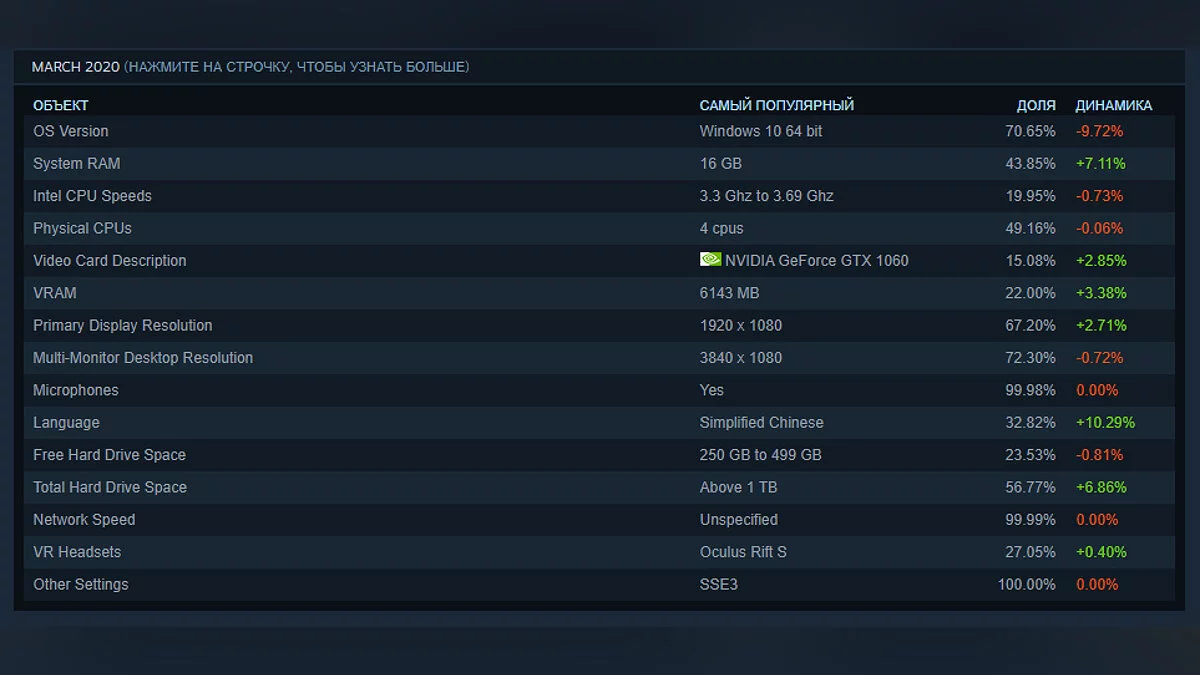 В Steam подвели итоги мартовского опроса, в ходе которого Valve выяснила, какое железо и ОС самое популярное среди пользователей этого сервиса.