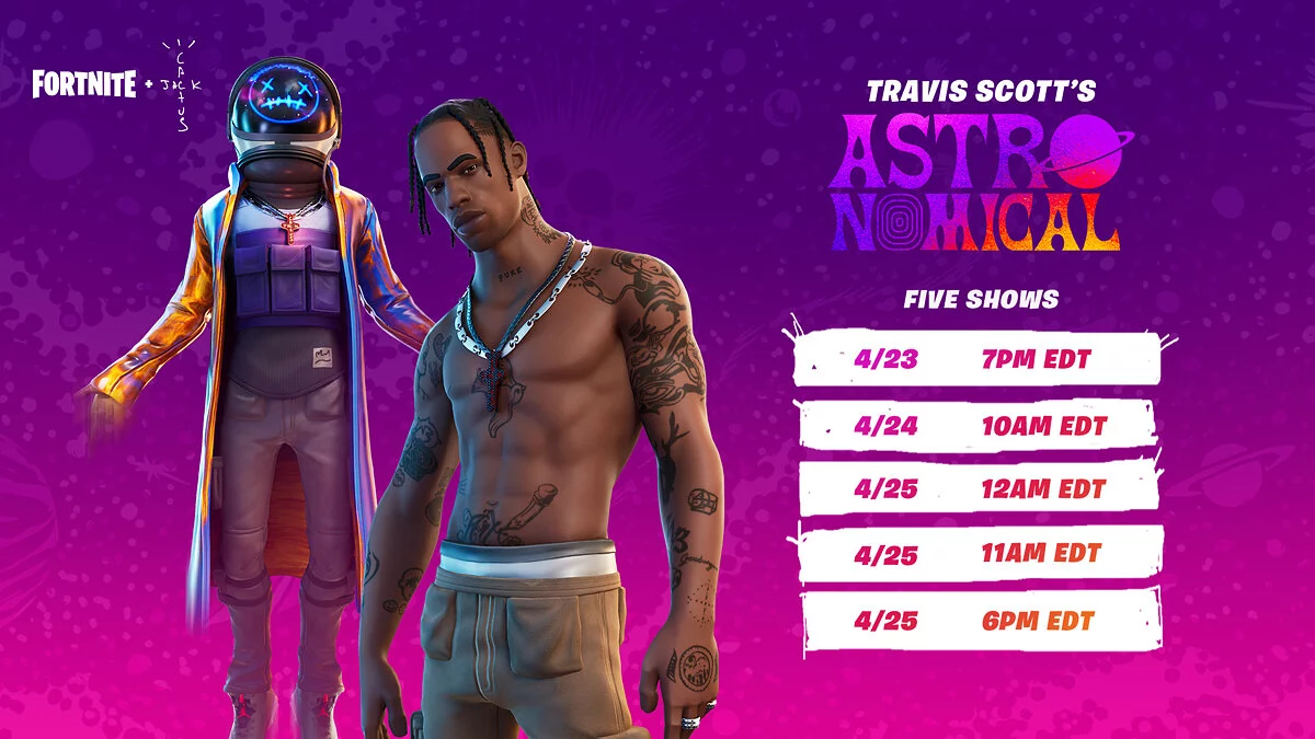 Концерт оказался эффектным: сначала на локации появился гигантский аватар рэпера, который начал зачитывать трек, потом с неба начали падать метеориты, а Скотт начал превращаться в терминатора. Затем все игроки переместились сначала под воду, а позже в космос. Под конец рэпер уже сидел на целой планете.