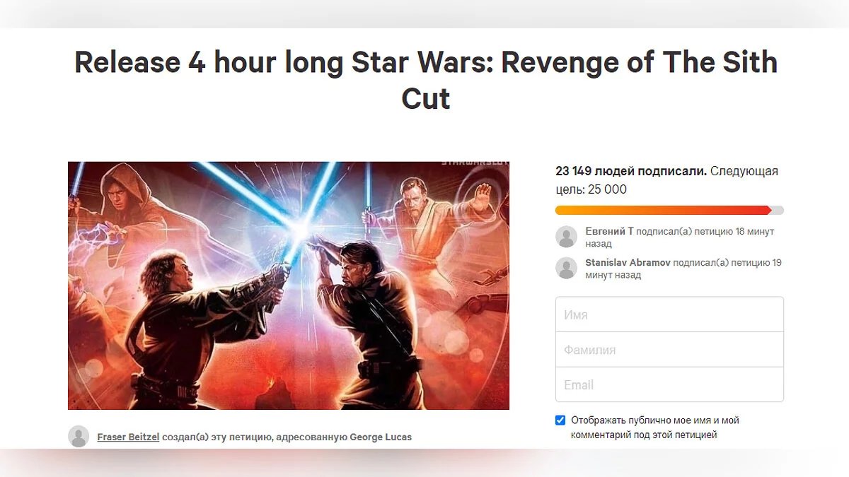 Всем привет! Первоначальная версия фильма «Звездные войны: Месть Ситхов» (2005) длилась более четырех часов, и мы считаем, что Джордж Лукас должен поступить правильно и дать фанатам то, что они заслуживают. Мы любим демократию и надеемся, что Джордж Лукас тоже. Подписывая это, вы позволяете вашим голосам быть услышанными. Если Джордж поступит правильно, он проявит себя как сильный и мудрый человек, и мы будем очень гордиться им. Да прибудет с вами сила и вера!