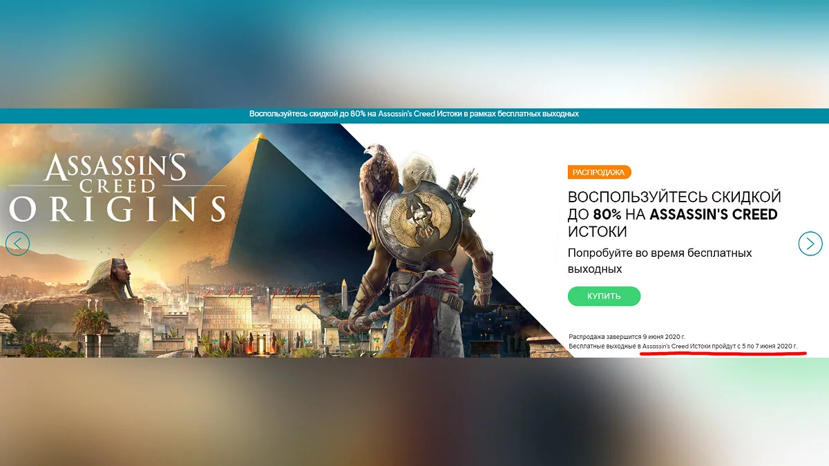 Ubisoft сделает Assassin's Creed: Origins временно бесплатной, о чем свидетельствует анонс в магазине Uplay. Список платформ, для которых актуальны бесплатные выходные, пока не сообщается, но на ПК игра точно будет доступна.