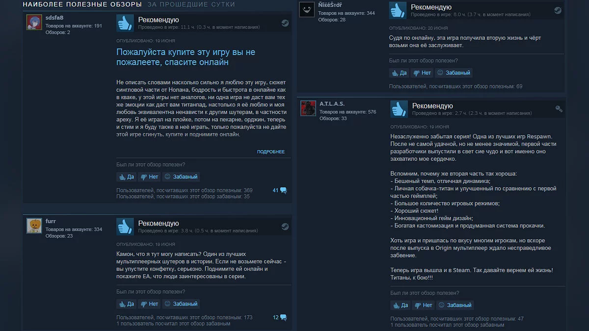 В отзывах к игре в Steam геймеры радостно пишут о том, что проект получил второе дыхание и заслуживает того, чтобы на него обратили внимание те, кто упустил Titanfall 2 в свое время.