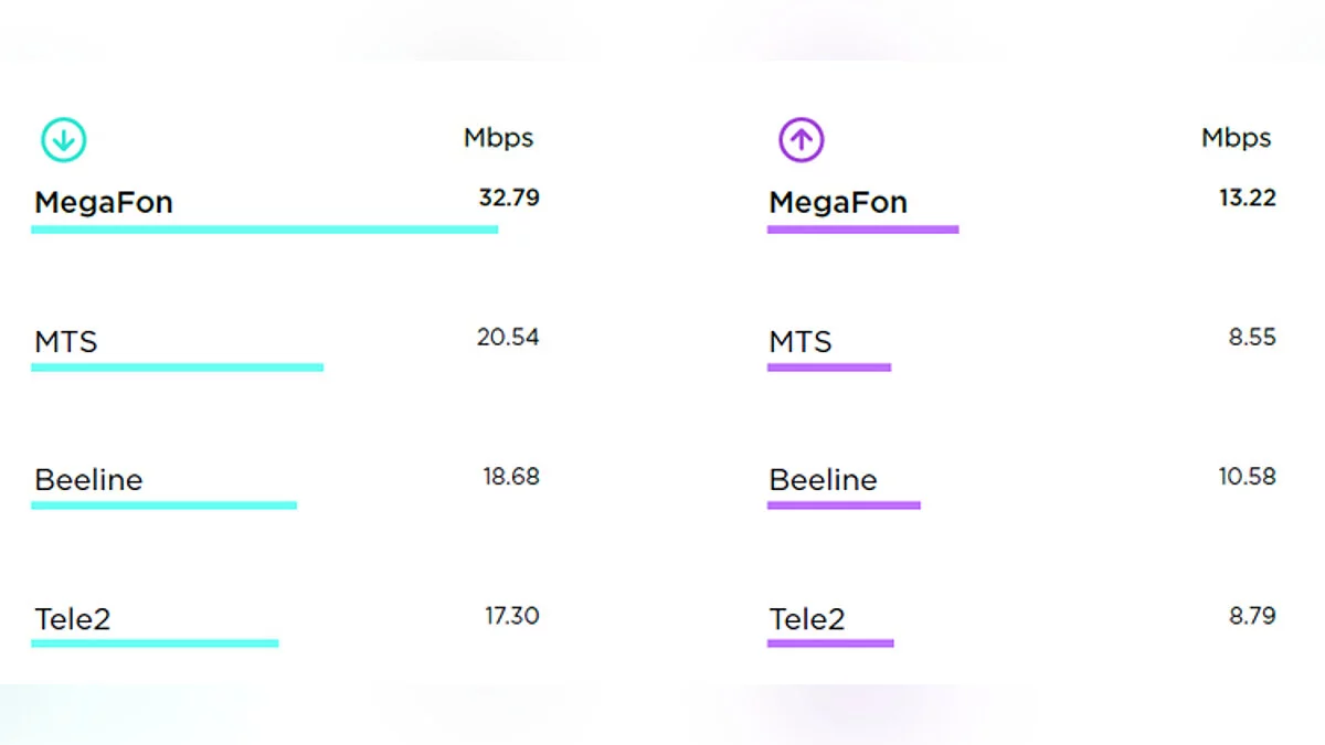 Победу одержал МегаФон. Его средние показатели составили 32,79 Мбит/с (скорость скачивания) и 13,22 Мбит/с (скорость загрузки в сеть).